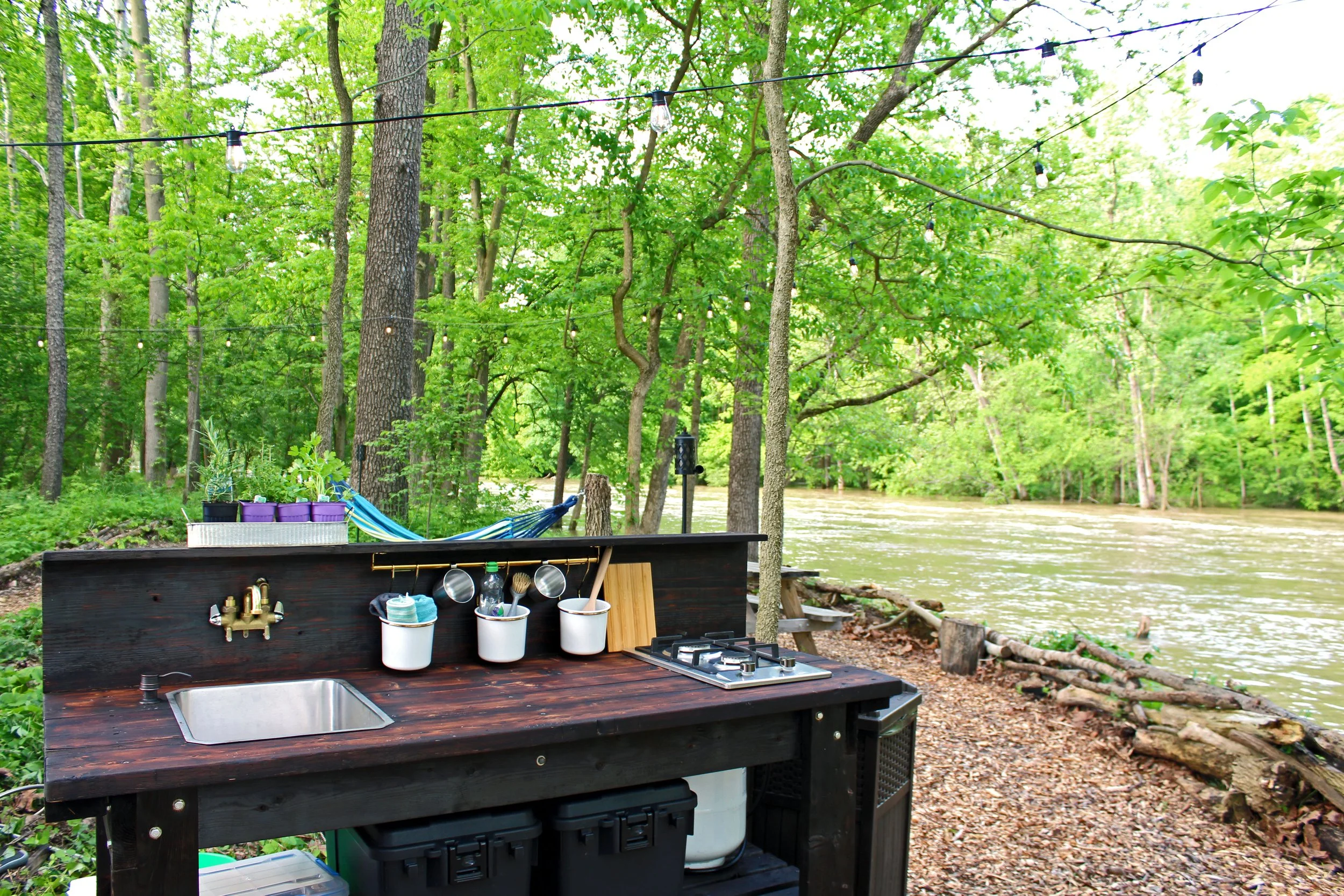 Right outside the tent, you'll have access to an outdoor kitchen with running well water and a propane stove with two burners for cooking. We provide all cookware, dishware, and kitchen essentials, plus a grate for cooking over the campfire. A bundle of firewood is included, with the option to purchase more on-site.