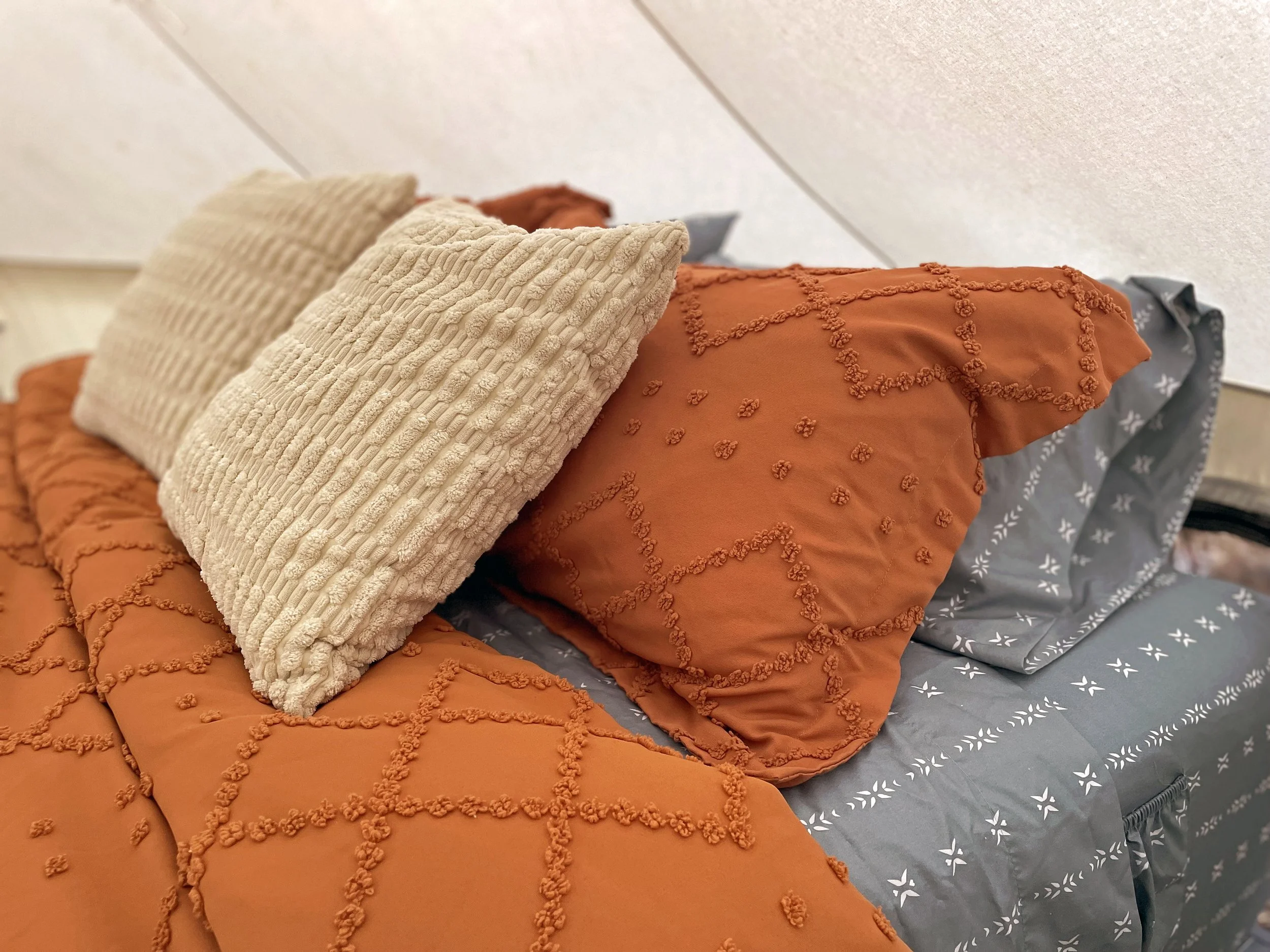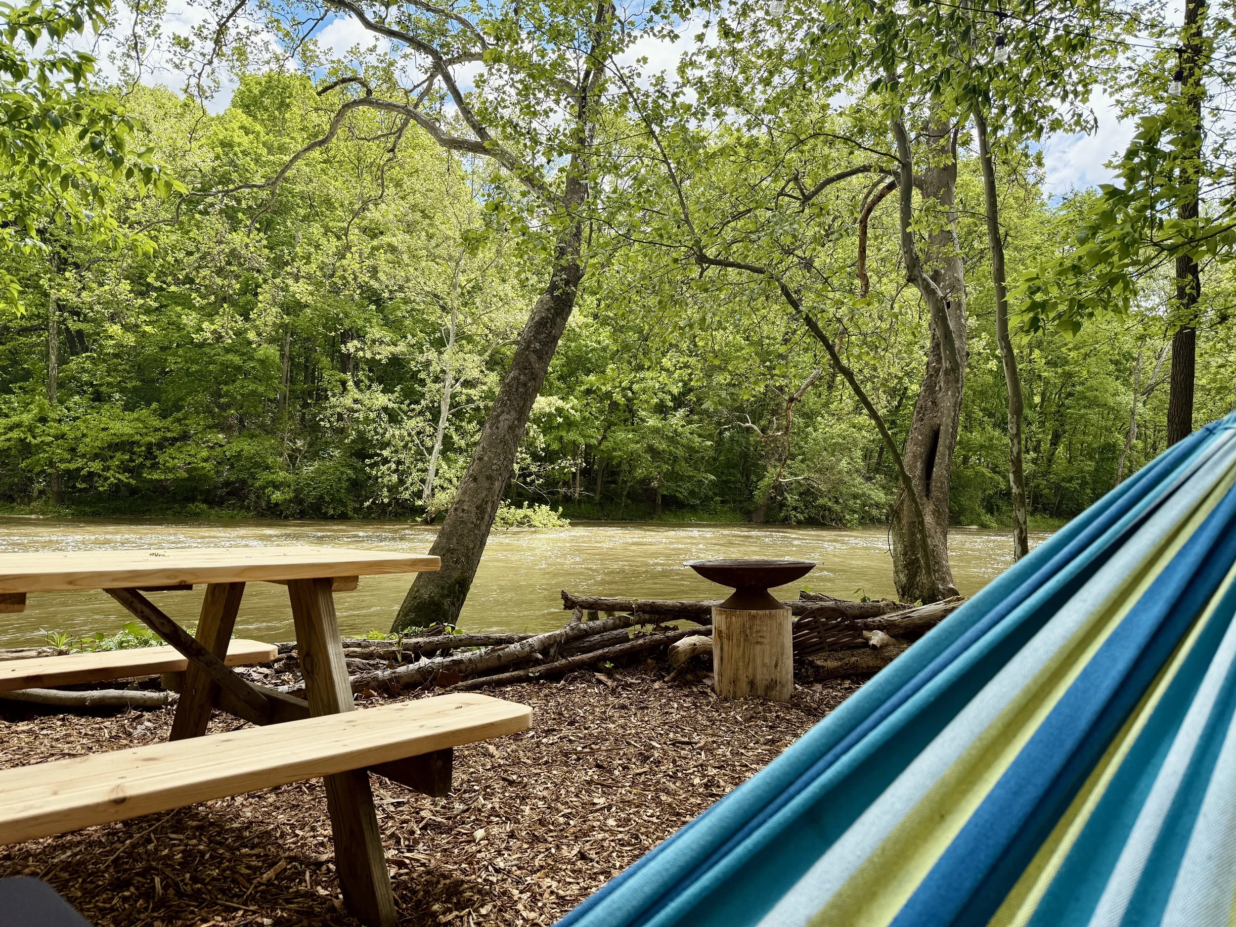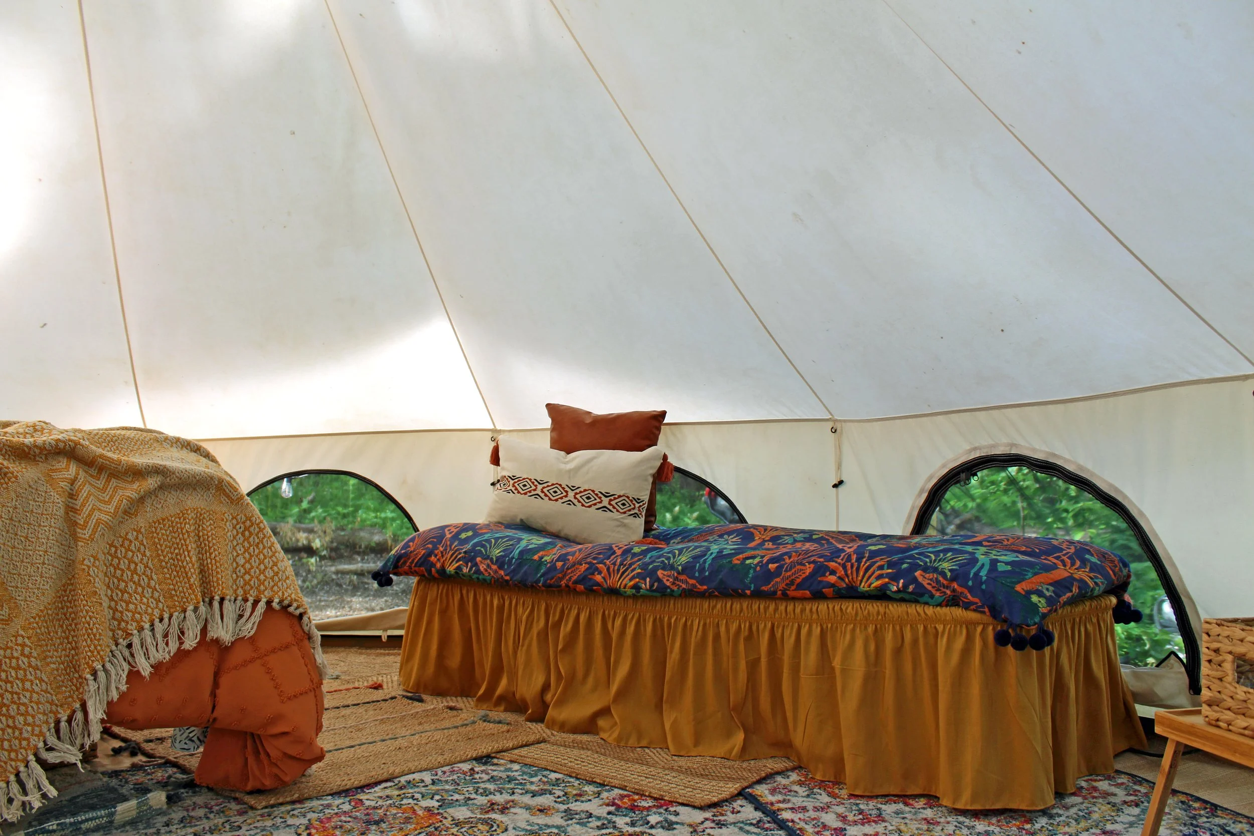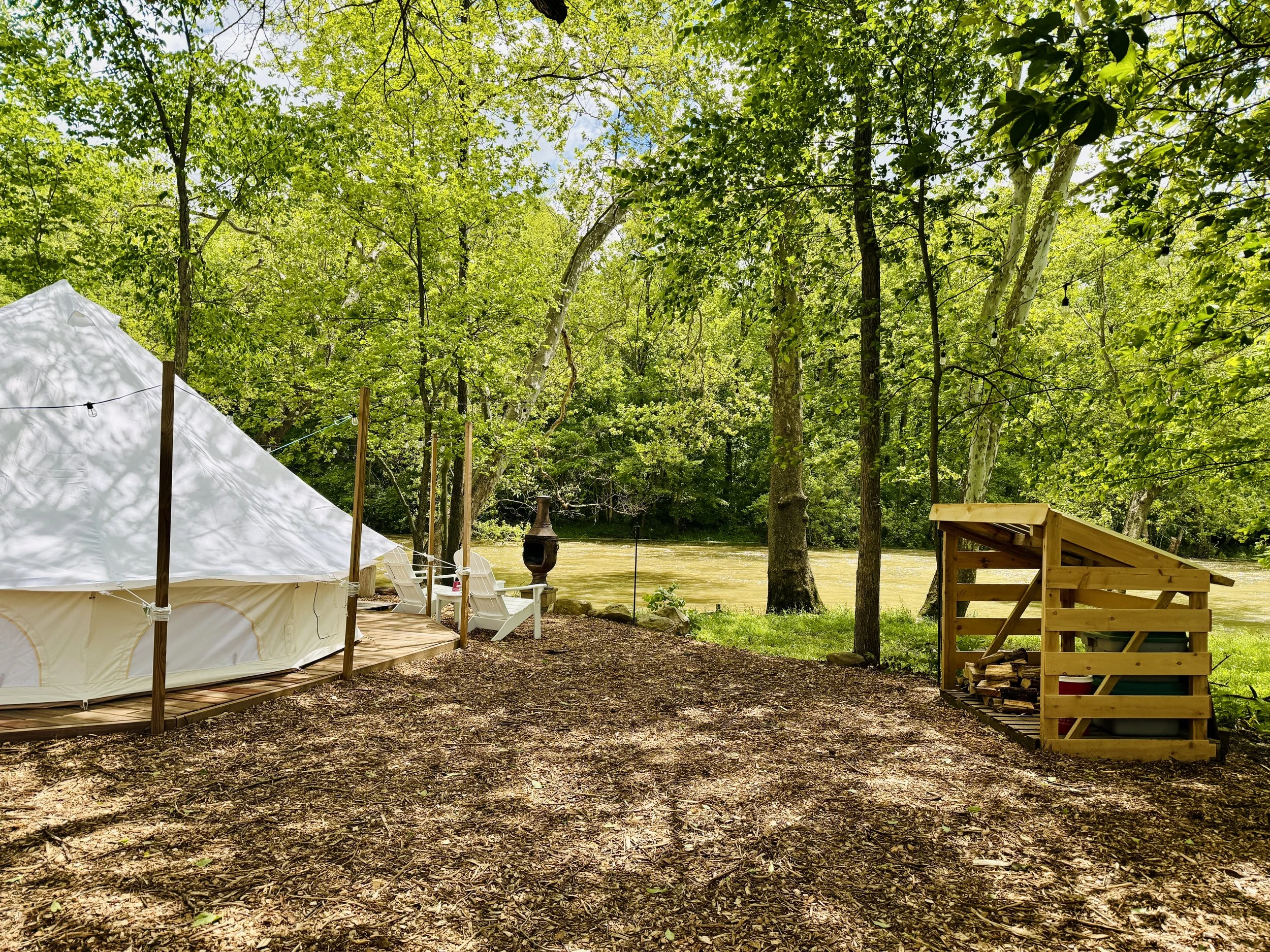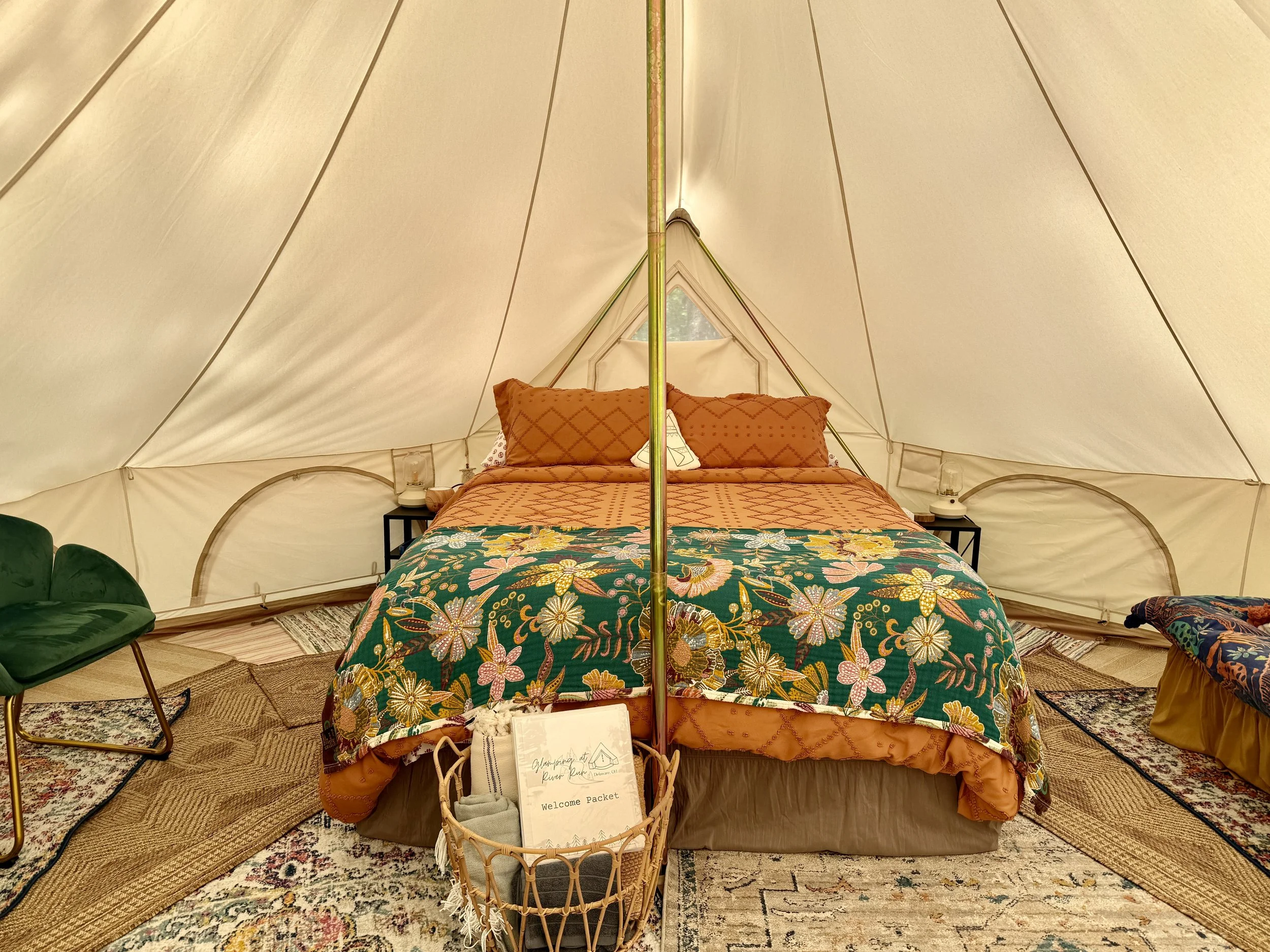 Nestled among a vibrant bloom of bluebells each spring, The Bluebell is a 16.5-foot canvas bell tent designed for comfort and relaxation. Thoughtfully furnished with bohemian décor, this charming retreat offers a queen bed with a memory foam mattress, ensuring a restful night’s sleep. Unwind as you take in serene views of historic Sycamore trees, watch blue herons fishing along the river, and drift off to the soothing sounds of the low-head dam nearby.