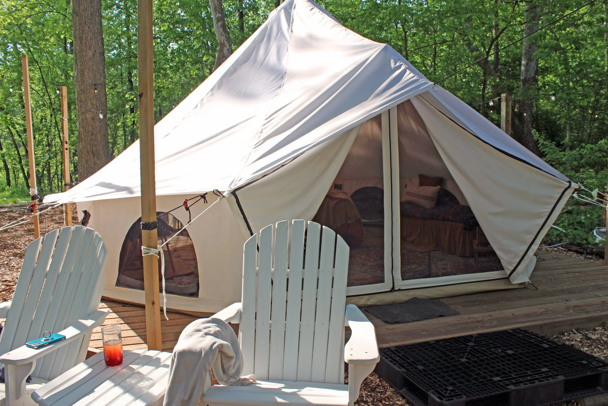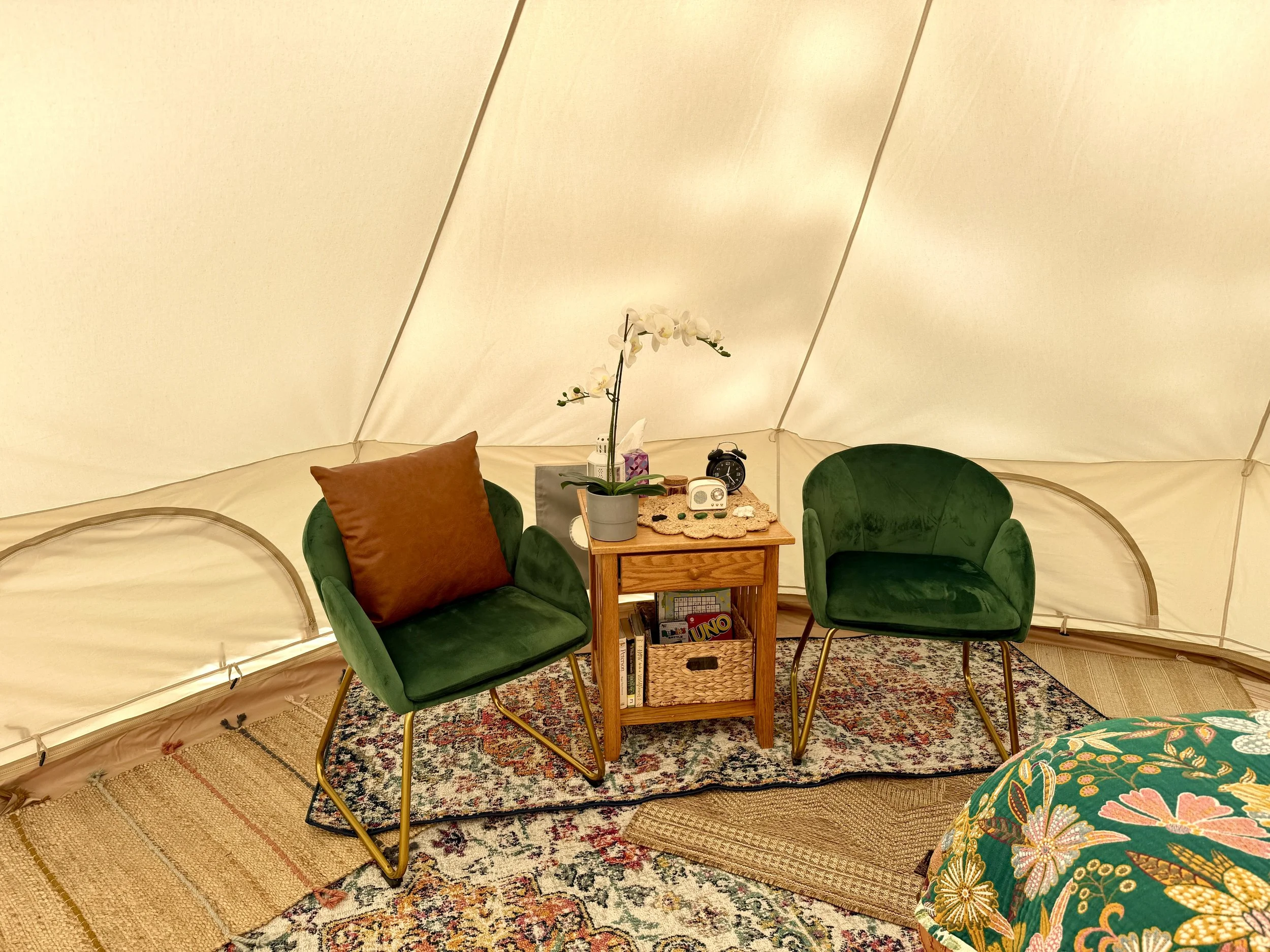 The tent is fully equipped with electricity to power your devices, along with indoor and outdoor lighting for convenience. Inside, you'll also find a camping cot with a mattress pad and bedding, perfect for a third guest or extra seating. A second padded camping cot can be added for a fourth guest at an additional charge.